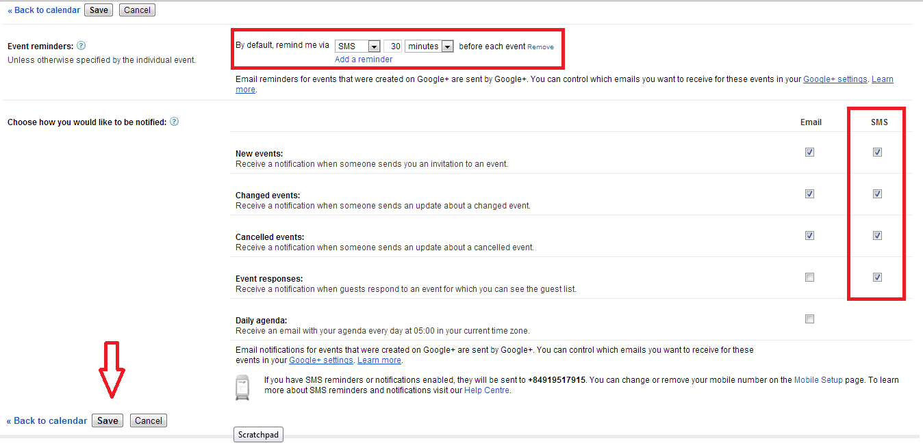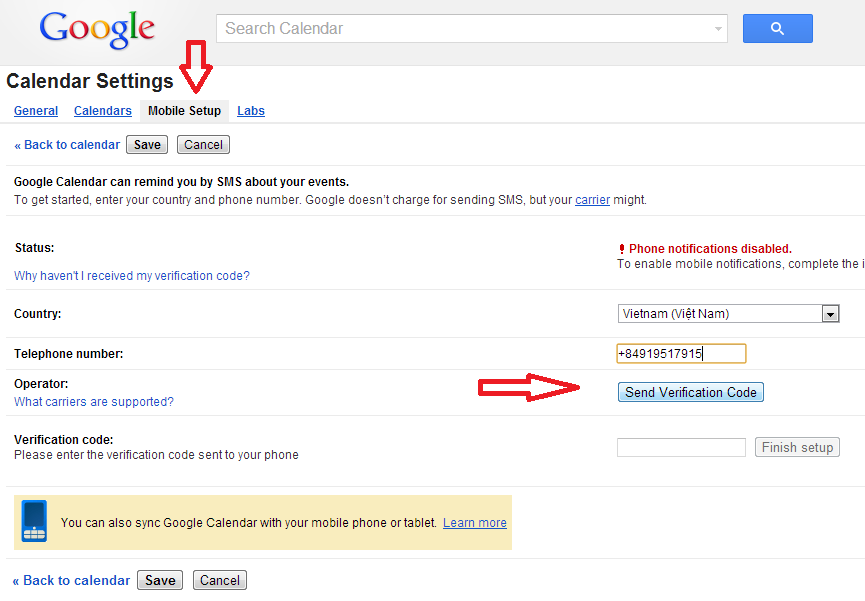 Xin lưu ý, nếu trong vòng vài phút bạn không nhận được tin nhắn, chắc chắn nhà mạng bạn đang dùng chưa được Google hỗ trợ. Thông tin cho thấy Google Calendar hiện giờ mới hỗ trợ gửi tin nhắn các thuê bao di động của VNPT (Vinaphone, Mobifone) ở Việt Nam.