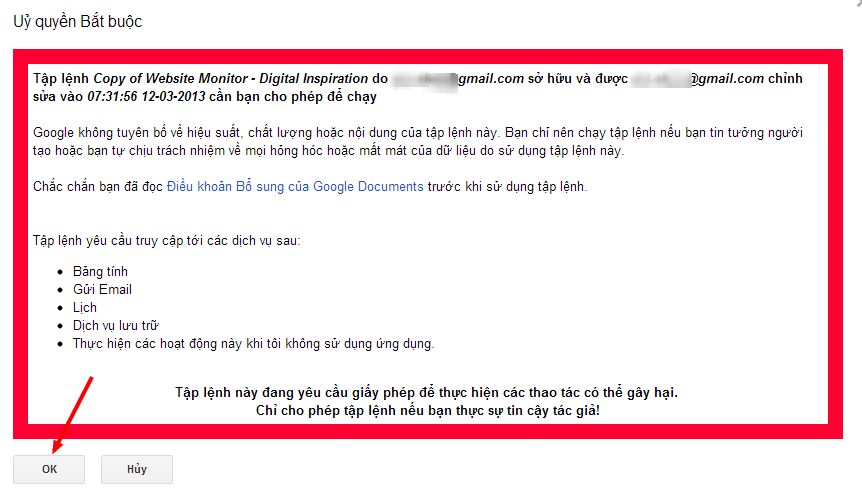 Bạn sẽ nhận được thông báo cấp quyền truy cập vào một số dịch vụ trên tài khoản Google, nhấp OK để tiếp tục.
